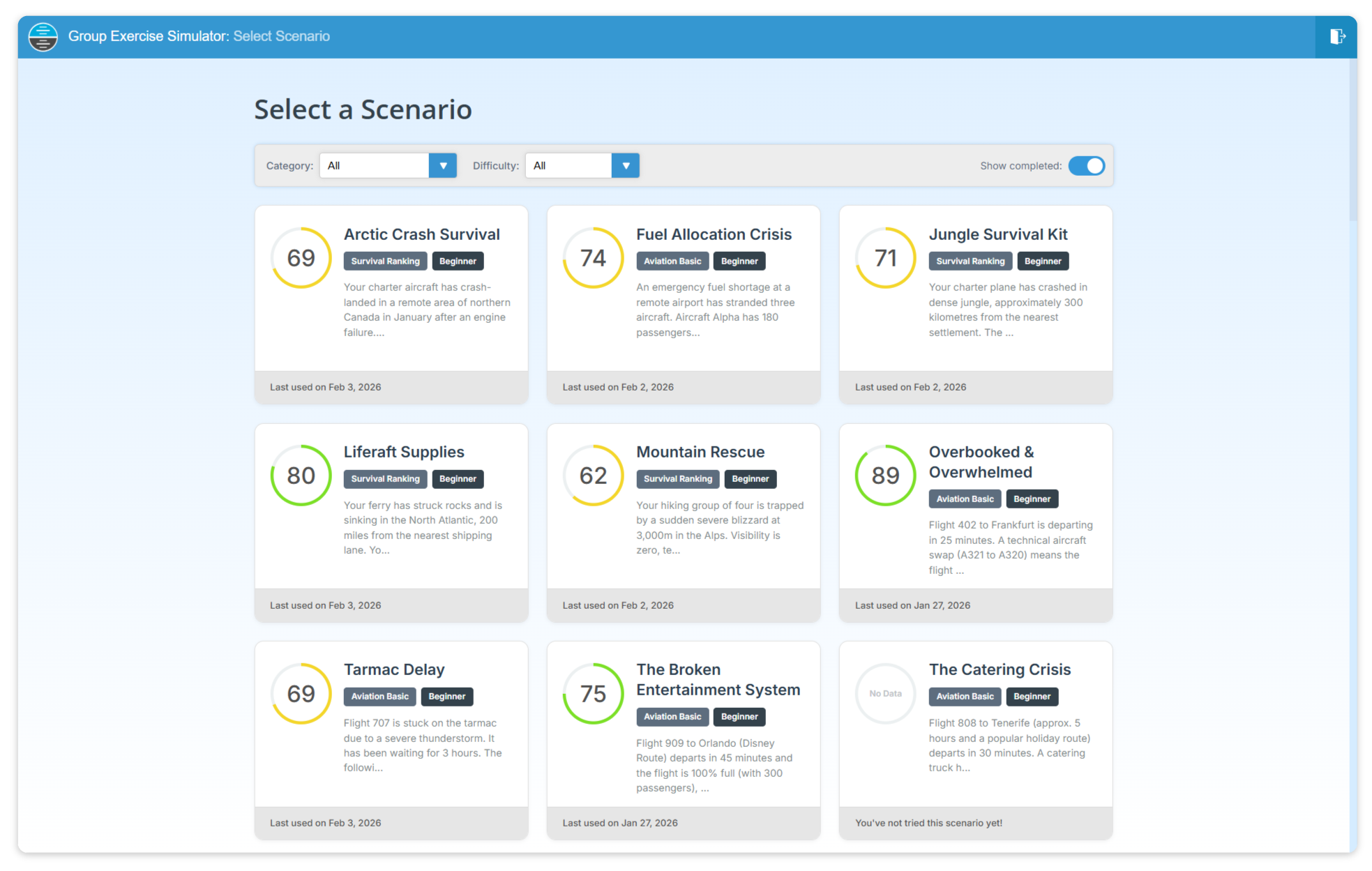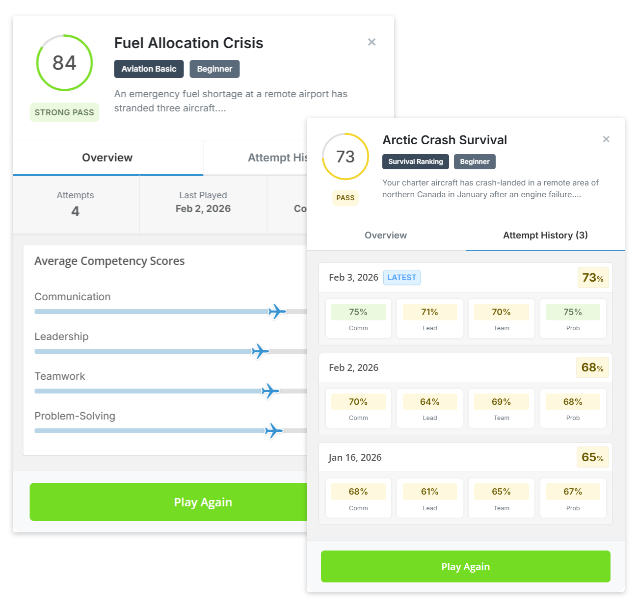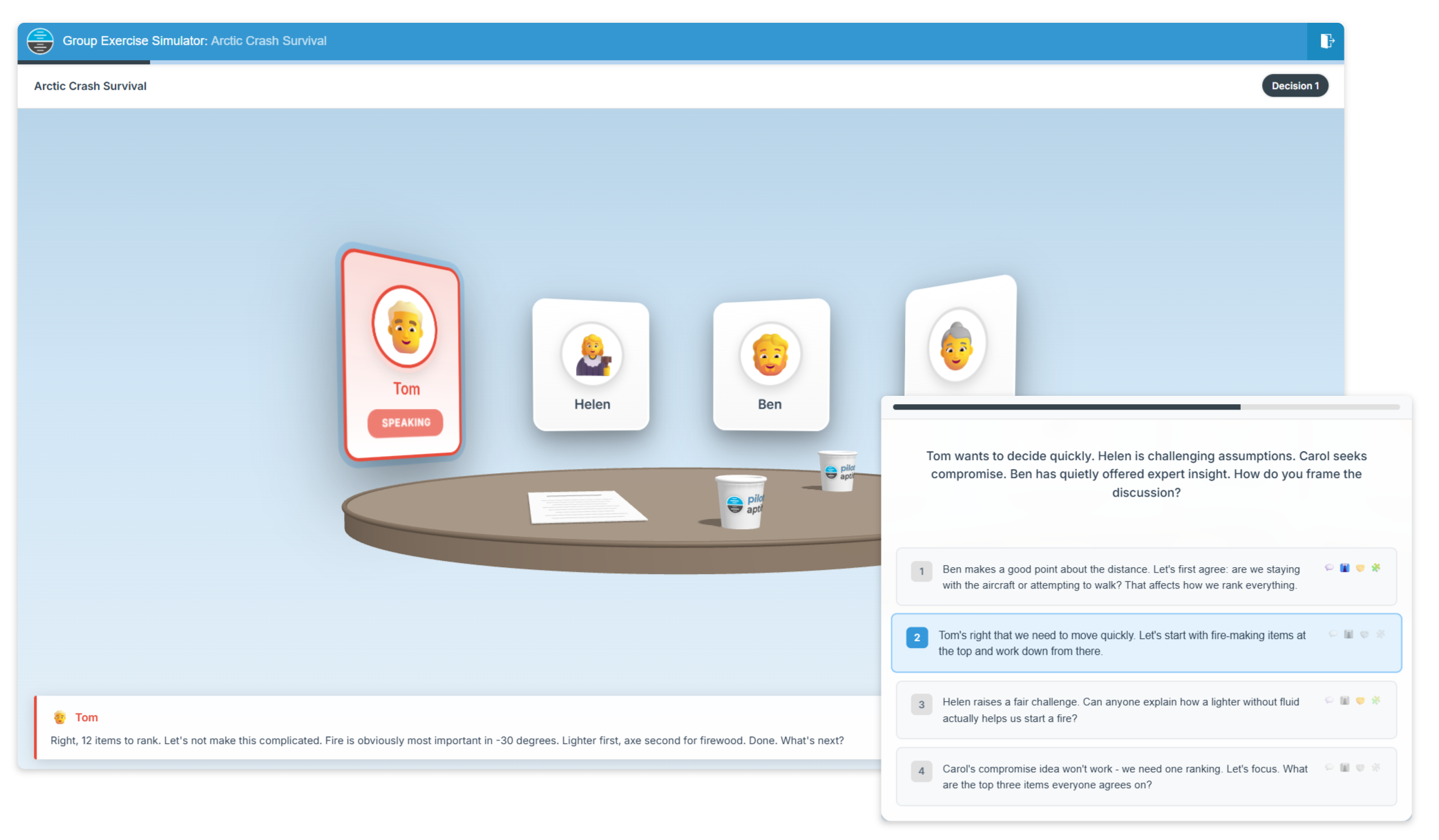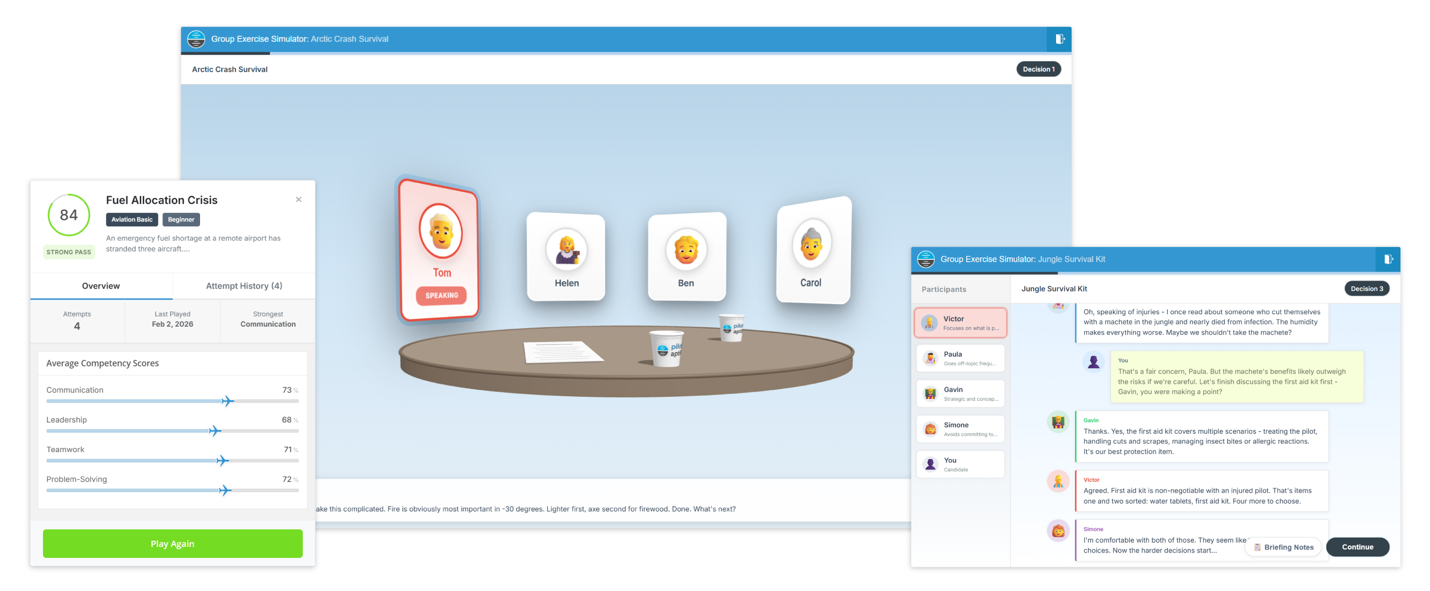 Engage with our Group Exercise Simulator featuring 50+ realistic scenarios modelled on real airline, flying school and cadet scheme selection exercises, complete with Virtual Candidates, various Branching Dialogue options and Competency-Based Feedback from four assessed areas - Communication, Leadership, Teamwork and Problem-Solving.