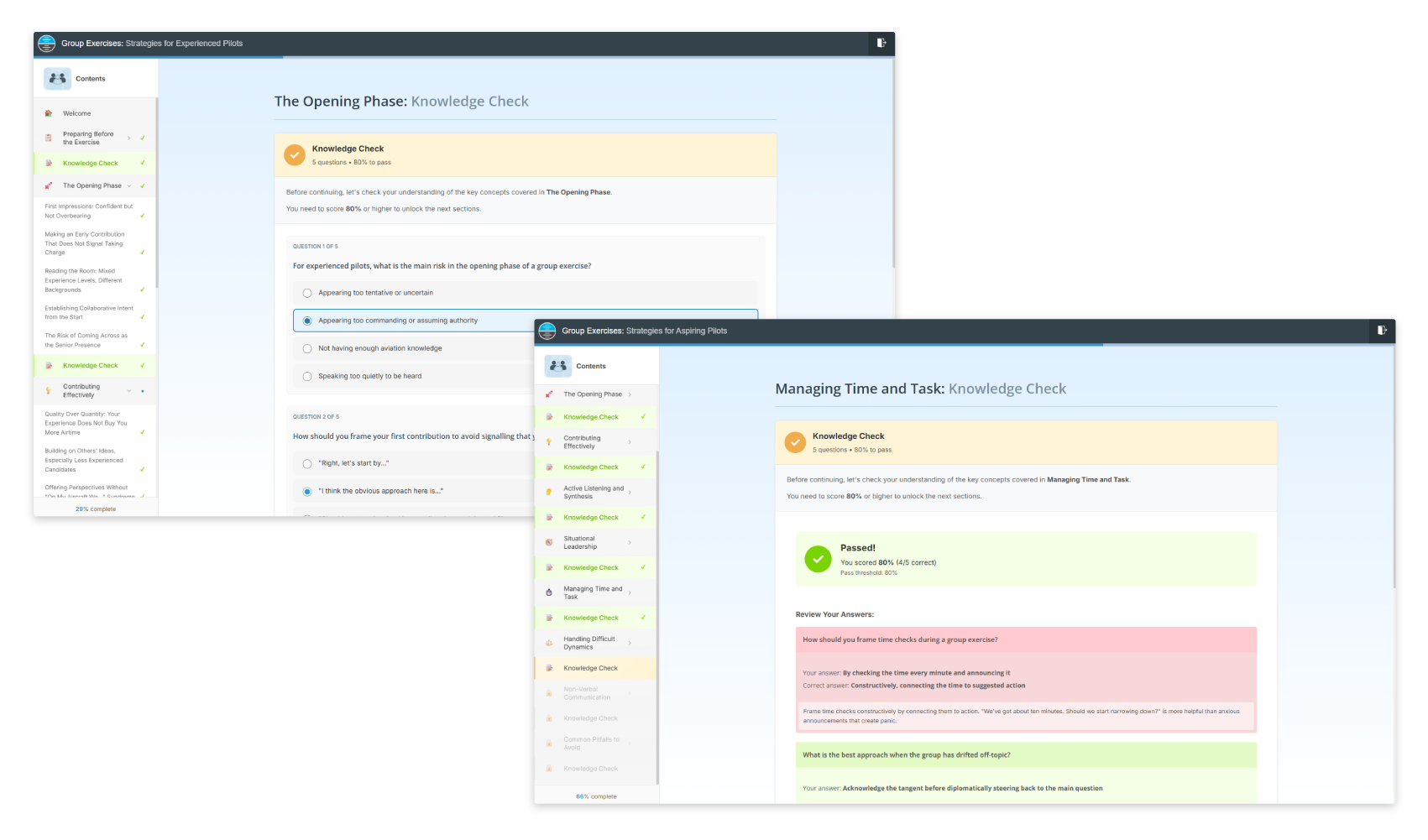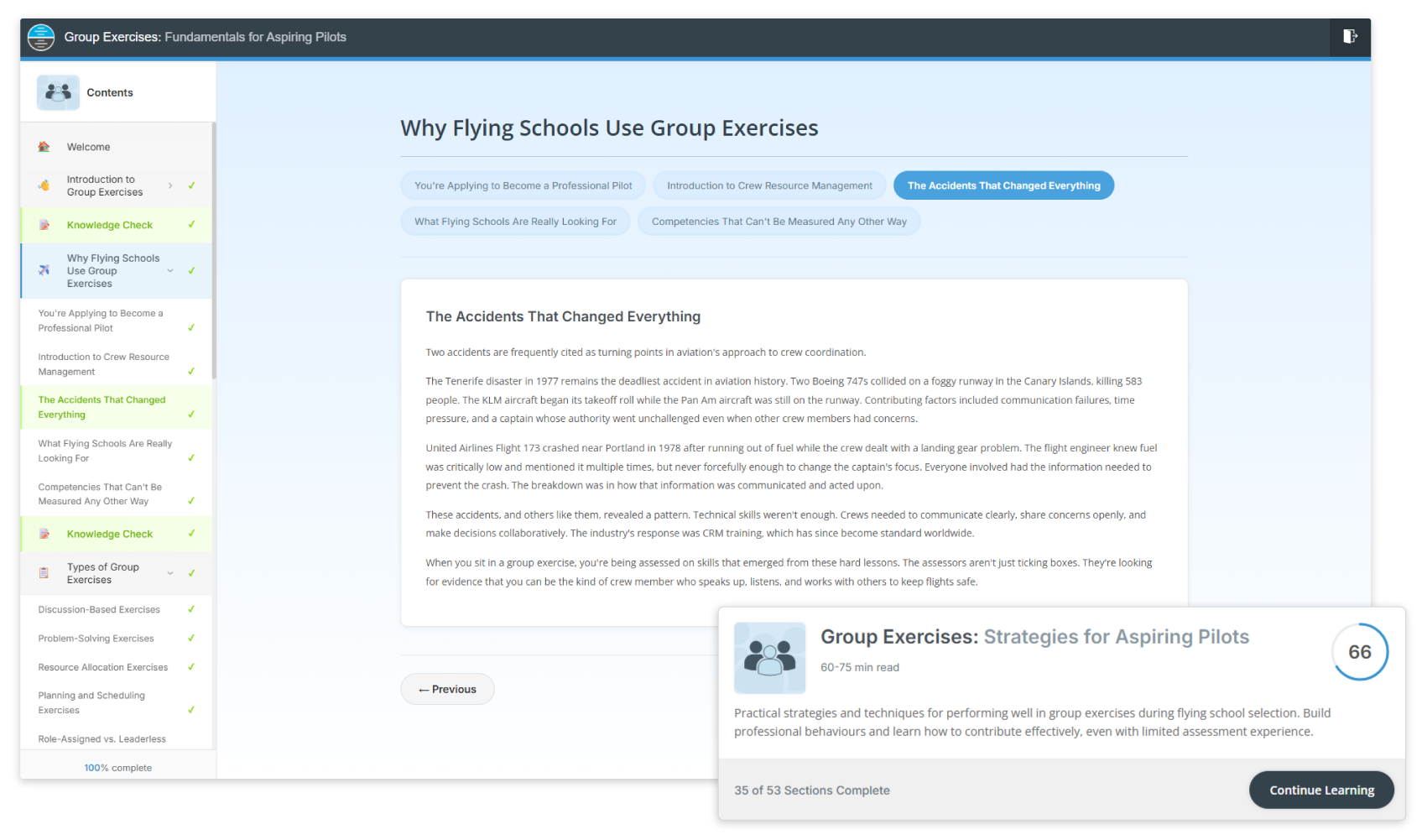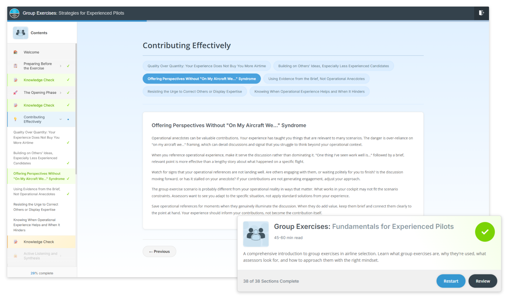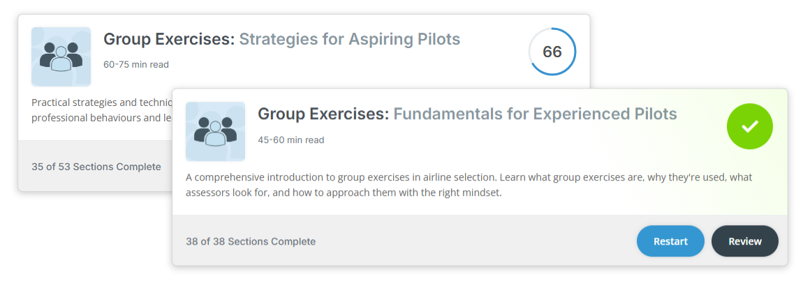 Yes, extensive instruction and guidance is provided within this software for the preparation of group exercises as part of a pilot assessment. In particular, four comprehensive E-Learning Modules are provided, covering Fundamentals and Strategies for both aspiring and experienced pilots, each accompanied with Knowledge Checks to reinforce your understanding. Additionally, thorough instruction is provided within our searchable and easily accessible User Guide, and a dedicated Overview Page helps you to navigate all Group Exercise content and track your progress.